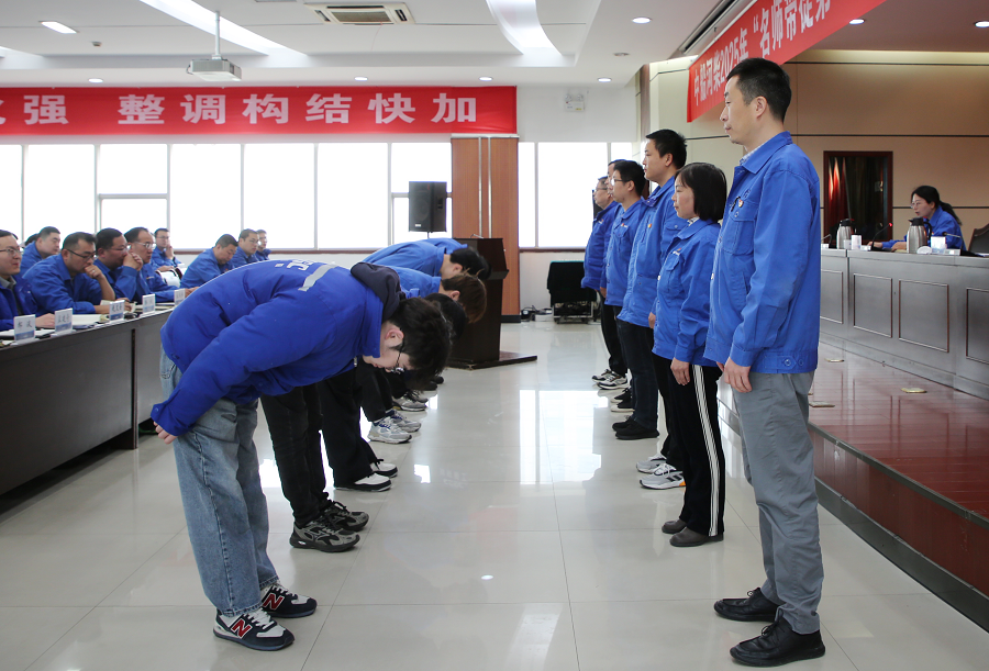 會議對 2024年度“名師帶徒弟,導師帶學生”活動進行了總結(jié),表彰了2024年度“優(yōu)秀師傅/導師”,宣讀了2025年度“名師帶徒弟,導師帶學生”結(jié)對名單。技能層面和技術(shù)層面的師徒代表進行了現(xiàn)場簽約,并舉行了傳統(tǒng)拜師儀式。大件制造廠張選偉、總裝廠鄭曉臣分別代表 2025 年度新簽約師傅、徒弟發(fā)言。